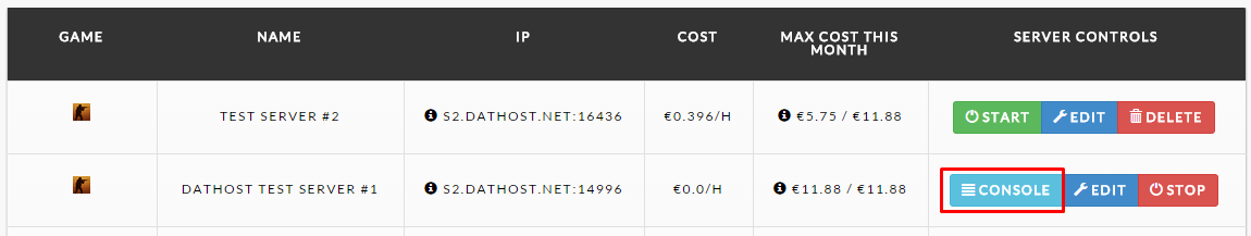 Unfortunately, eBot doesn’t work with hostnames which is what we use on DatHost.net (for example S2.DatHost.net. Some customers also set up custom hostnames. To get the IP of your server, click on the Console button in the control panel: