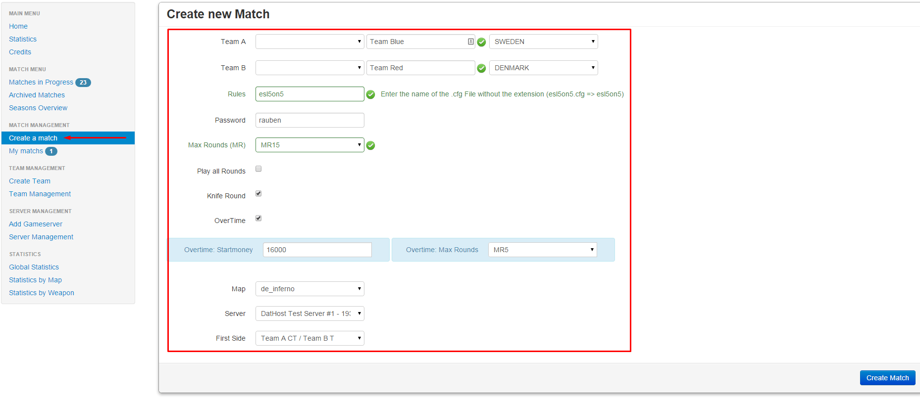 After creating your server, click on “Create a match” and fill in the form here, to start using eBot. Enter the name of the teams who are playing, enter the config you want to run on your server(if you’re using a custom config, remember to add the correct path) and all other match settings. Finally select the server you added as the server to use, and click on “Create Match”.