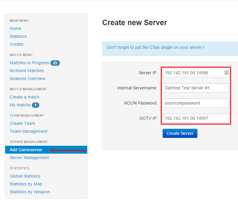 After logging in, click on “Add Gameserver” to add your gameserver so you can use ebot. In the form, fill in the requested details then click “Create Server” to finish. In the “Server IP” field, you fill in the IP and port we retrieved in the previous step. Internal Servername can be anything that you easily remember, so you know which server this is. After that, fill in the RCON password of your server and optionally enter a GOTV IP. The GOTV IP can use hostnames, as it’s only used for display on the site.