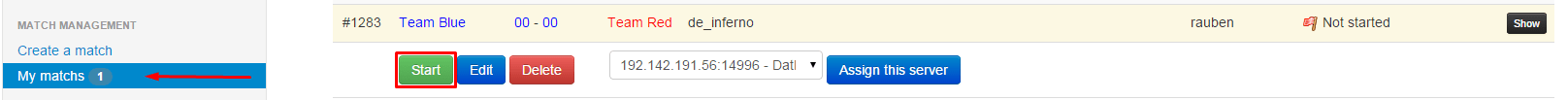 Finally, start the match by clicking on “My matchs” and then click the “Start” button for your match. You’ll then be given a password and IP (both of them we set earlier) which you can use to connect.
