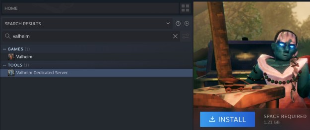 The search results will show the option Valheim Dedicated Server, click “INSTALL” on it.